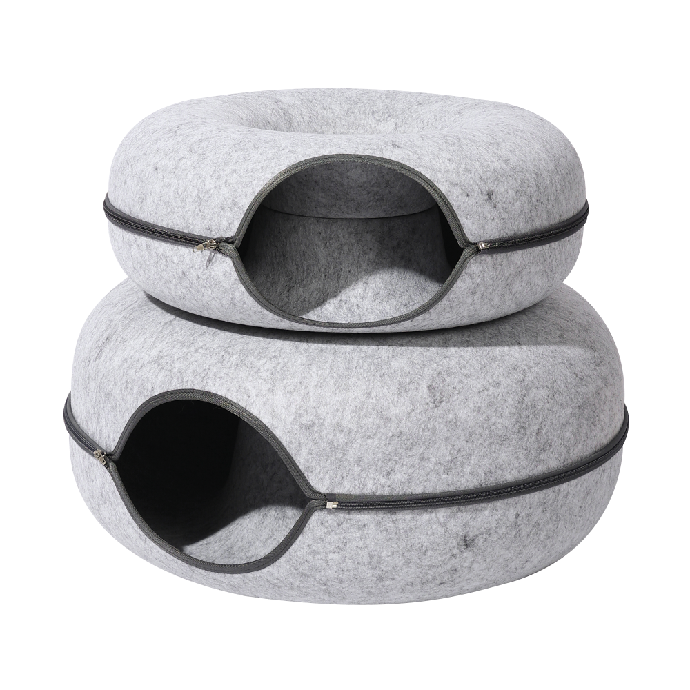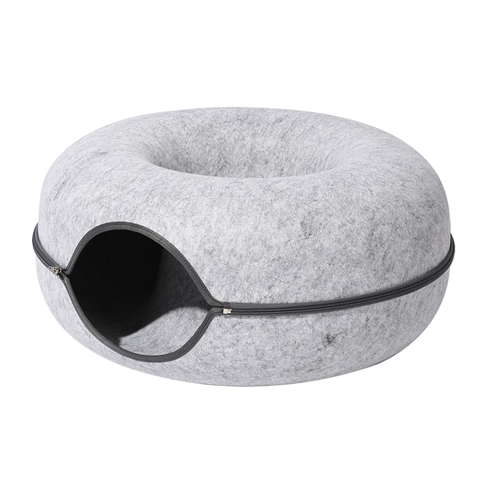 Cats love a cozy, hiding spot. Donut Tunnel Bed is a cosy, round tunnel built for playing, hiding and sleeping. With its soft felt material, your cat will feel comfy and warm while lounging on it. This cozy bed tranforms into a tunnel by unzipping it. Add some balls inside the tunnel to make it more fun!