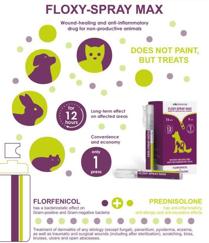 Treatment of dogs, cats and rabbits of decorative breeds with dermatitis, panaritium, pyoderma, eczema, as well as with wounds (including after castration), with scratching, bites, bruises, ulcers caused by pathogens susceptible to Florfenicol.