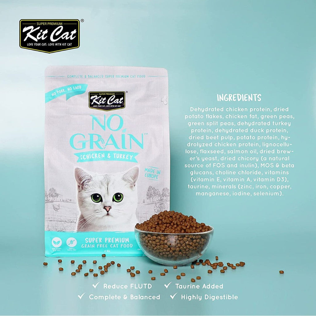Kit Cat No Grain™ Chicken & Turkey Cat Food provides your cats with the nutrition they need while promoting gut and coat health. Easily digestible and highly nutritious, this recipe is packed with Omega 3 & 6 for shiny and lustrous and coats, as well as essential vitamins and nutrients for a balanced diet. Enjoy peace of mind knowing your cats are receiving the best quality food for their unique needs.