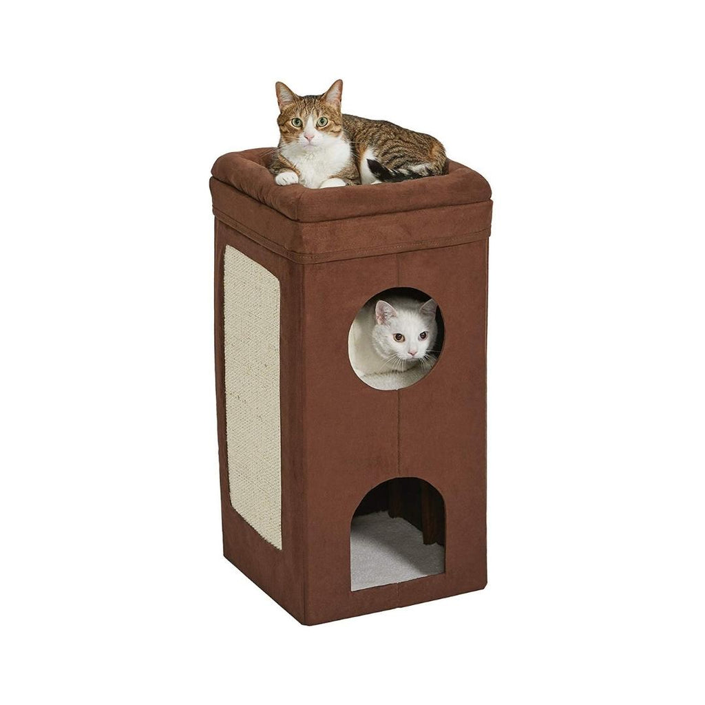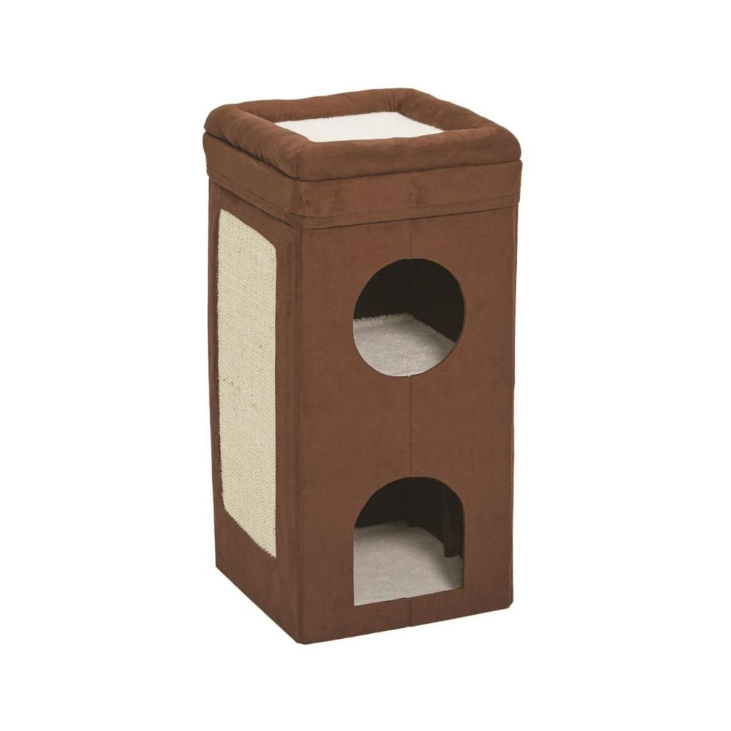 Brown suede and fleece cat two-story condo that features a scratching wall, two hide-outs, and a comfortable cushioned top.