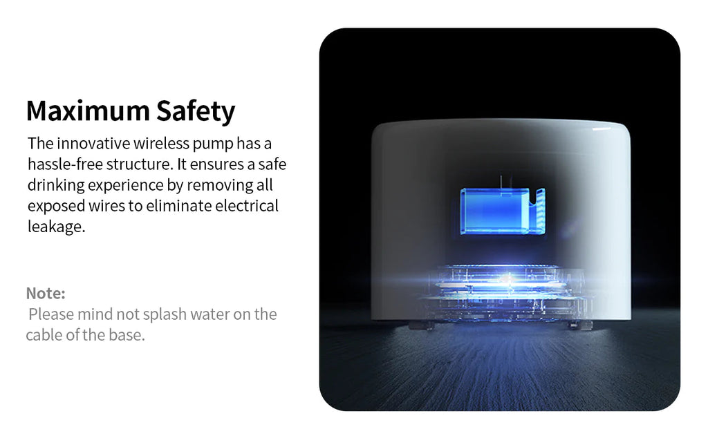 Safe Drinking Experience: No exposed wires to keep your pets safe while drinking from the fountain. (please do not splash water on the cable of the base)