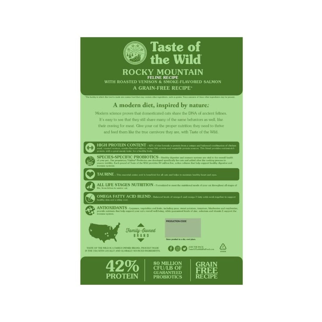 Taste Of The Wild Rocky Mountain Feline Recipe with Roasted Venison and Smoked Salmon Cat Food With 42% protein, this recipe is packed with highly digestible energy for cats of all ages. The unique combination of roasted venison and smoked salmon gives your cat the ideal protein for a lean and healthy body. In contrast, legumes, vegetables, fruits, and carefully selected ingredients provide them with the balanced nutrition nature intended.
