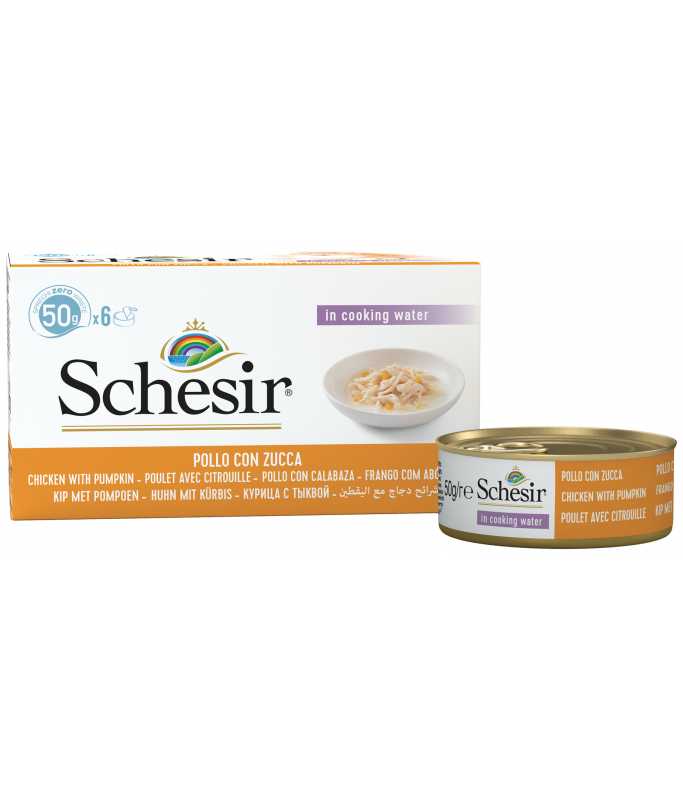 The main ingredient of the recipe is chicken Paired with a delicious pumpkin topping All ingredients selected by Schesir are 100% natural Steamed and hand-processed ingredients All Schesir products are without added preservatives and dyes